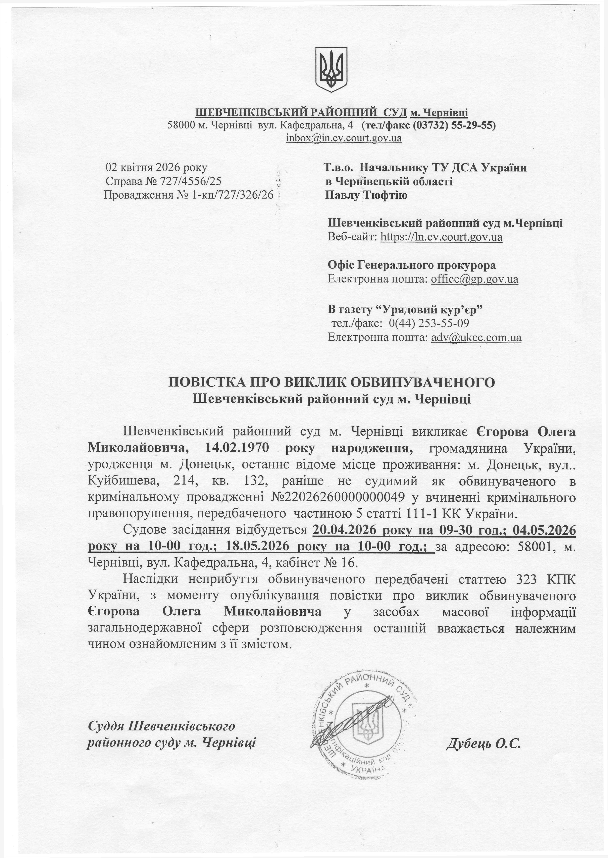 Повістка про виклик до суду Єгорова Олена Миколаївна