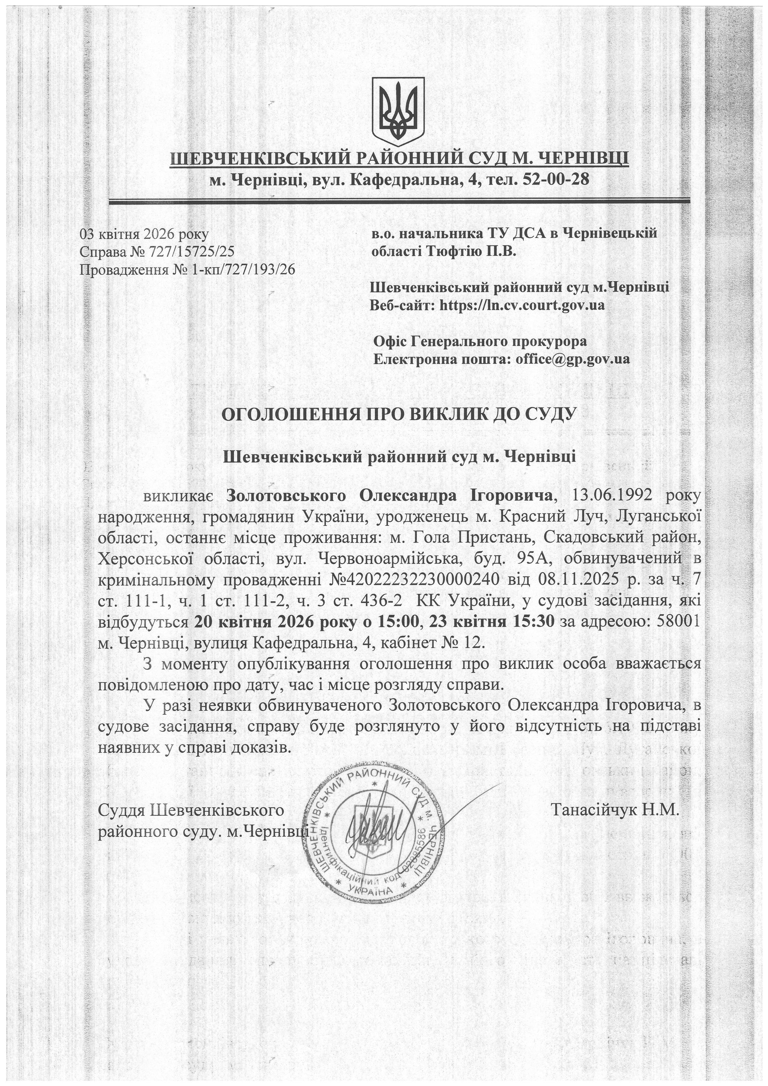 Оголошення про виклик до суду Золотовського Олександра Ігоровича