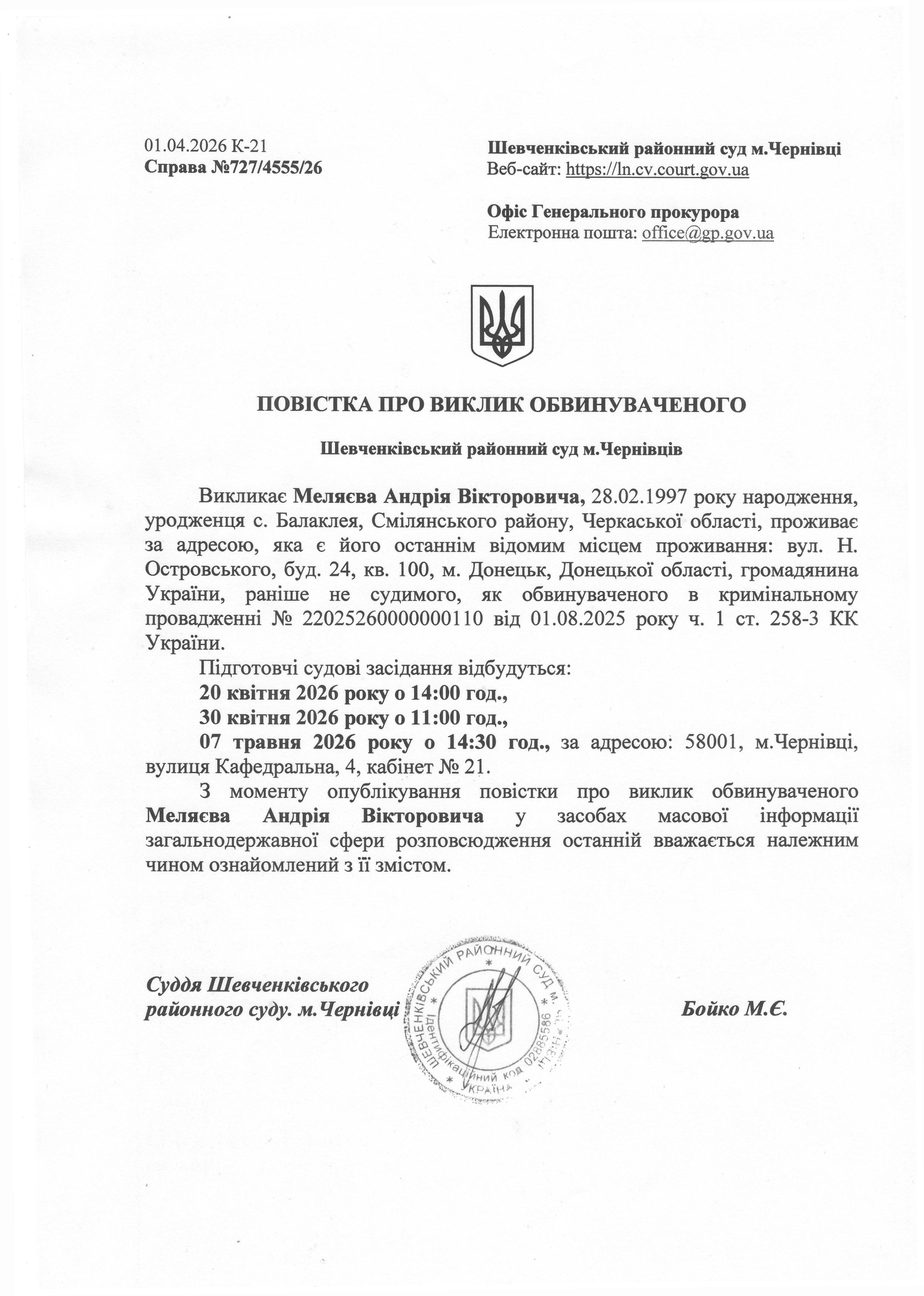 Повістка про виклик до суду Мєляєва Андрія Вікторовича