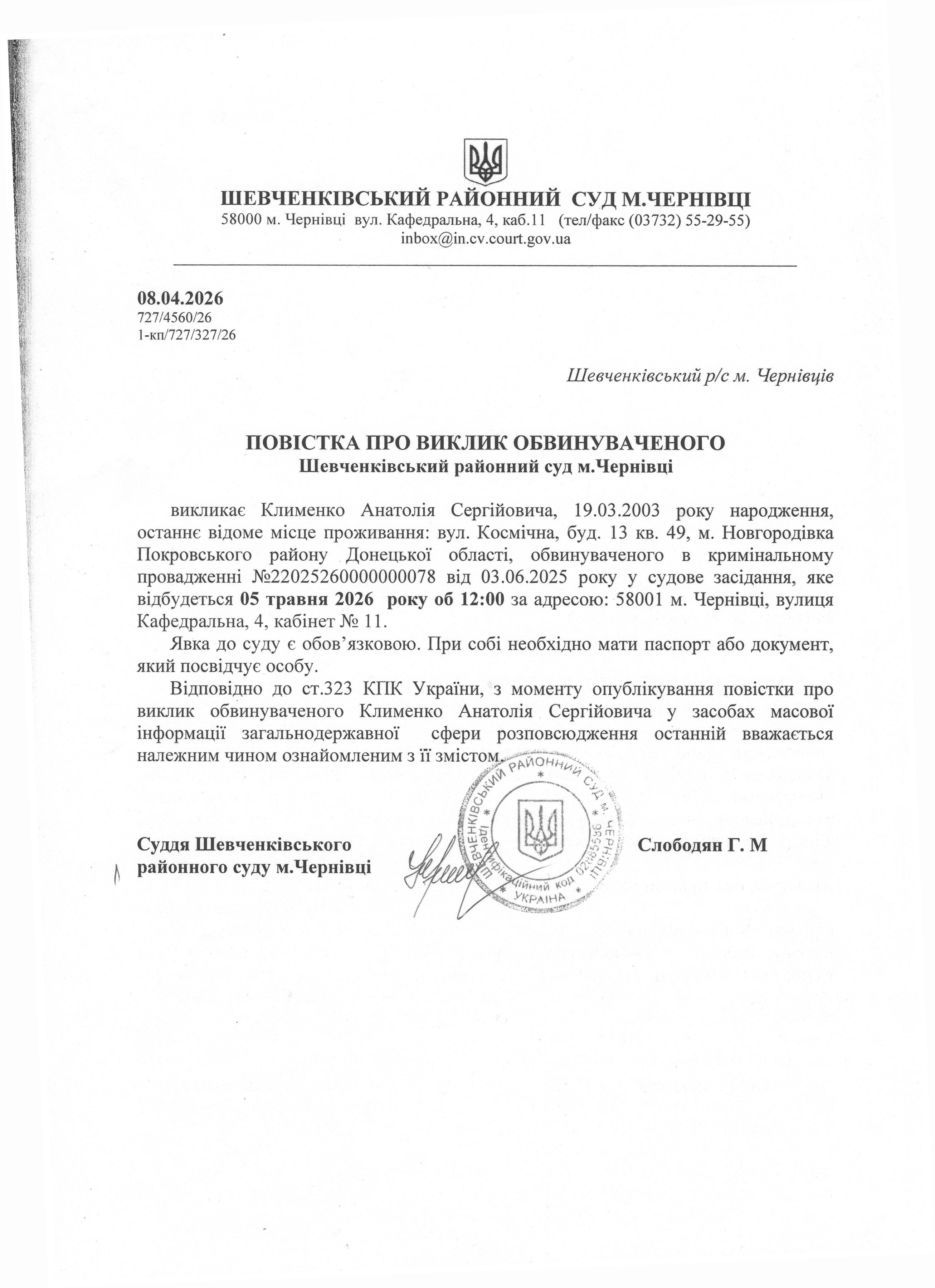 Повістка про виклик до суду Клименко Анатолія Сергійовича