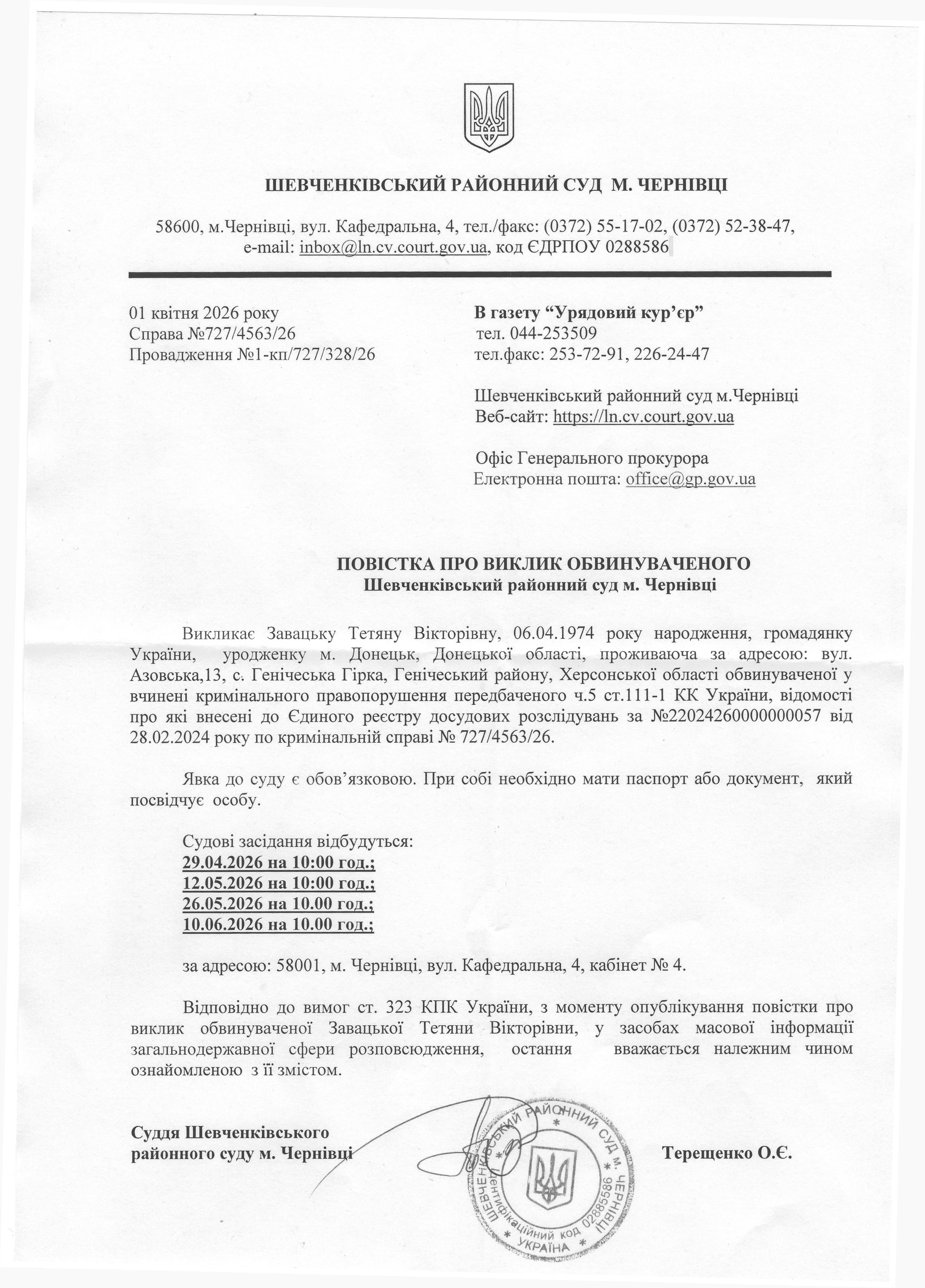 Повістка про виклик до суду Завацьку Тетяну Вікторівну
