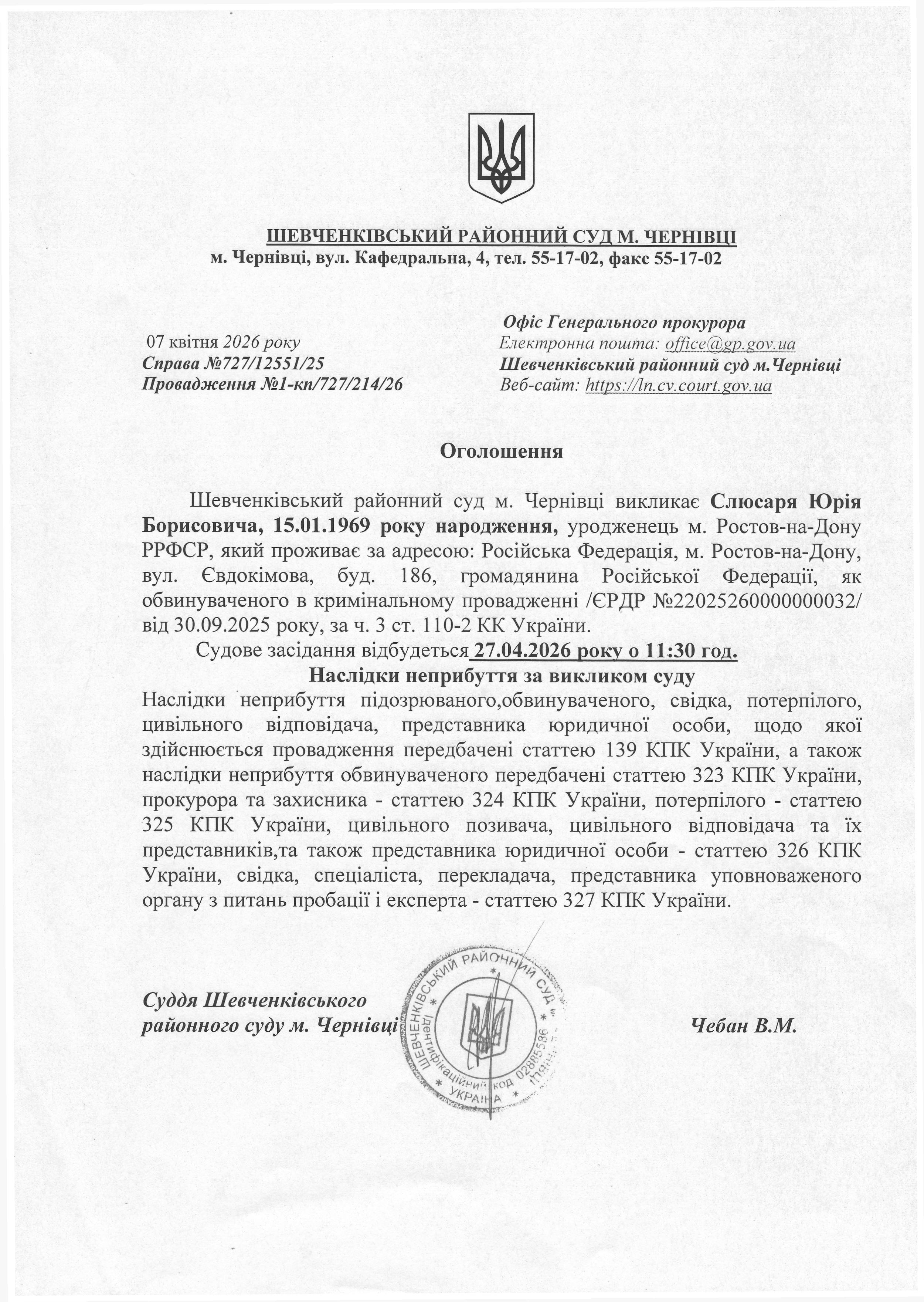 Оголошення про виклик до суду Слюсаря Юрія Борисовича