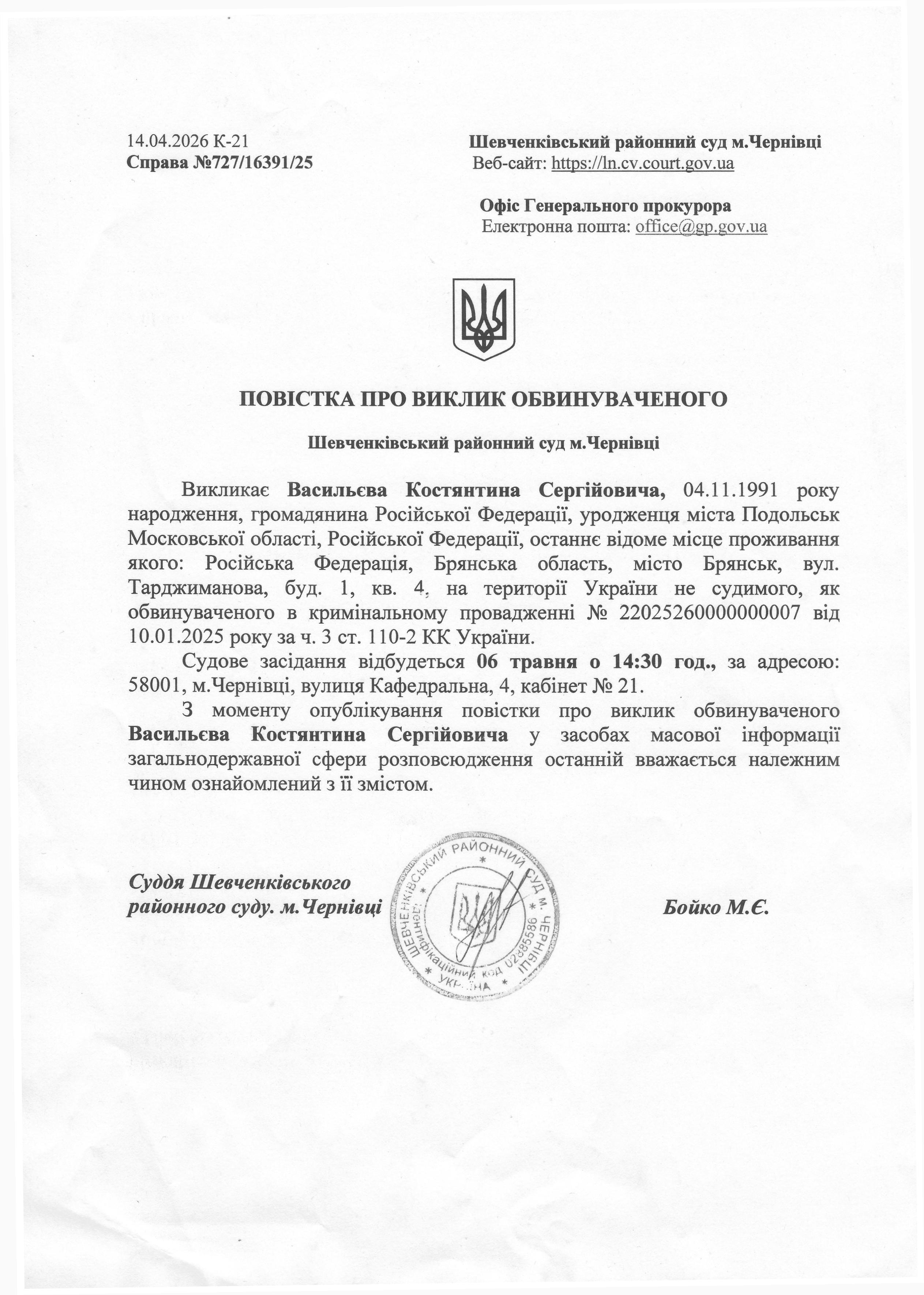 Повістка про виклик до суду Васильєва Костянтина Сергійовича